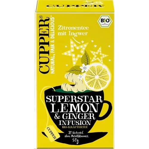 CUPPER Citrom & Gyömbér bio tea - 20 db teafilter. Citrom és Gyömbér a megunhatatlan páros mely napindítónak is tökéletes. Koffeinmentes! Összetevők: citromfű*, gyömbér gyökér* (25%), citromverbéna, édesgyökér, citromhéj*(7%), természetes citromaroma* (6%), narancshéj*. Édesgyökeret tartalmaz! Magas vérnyomásban szenvedők, kerüljék a túlzott mértékű fogyasztását! *Összetevők: Ellenőrzött ökológiai gazdálkodásból. Gyártó: Kallo Foods Ltd., UK. Tárolás: Hűvös száraz helyen. Minőségét megőrzi: lásd a doboz alján. Nettó súly: 50 g. Forg.: Ginger Design Kft. 1087 Budapest, Asztalos Sándor u. 5-7. www.gingerdesign.hu; www.teabox.hu; Forgalmazást ellenőrző szerv: Bio Garancia Kft. (HU-ÖKO-02)