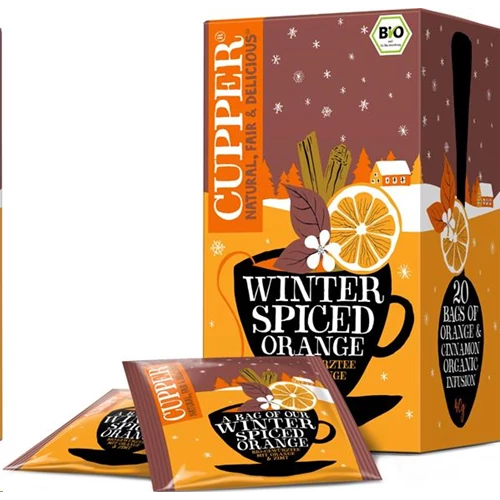 CUPPER Winter Spiced Orange – Téli fűszeres Narancs bio tea. -20 db teafilter. Összetevők: fahéj* (40%), mézbokor*, édesgyökér*, fehér hibiszkusz*, természetes narancs ízesítéssel*, narancshéj*(2%), cikória*, szegfűszeg*. *Összetevők: Ellenőrzött Ökológiai Gazdálkodásból! Édesgyökeret tartalmaz! Magas vérnyomásban szenvedők kerüljék túlzott mértékű fogyasztását! Gyártó: Kallo Foods Ltd., UK. Tárolás: Hűvös száraz helyen. Minőségét megőrzi: lásd a doboz alján. Nettó súly: 40 g. Forg.: Ginger Design Kft. 1087 Budapest, Asztalos Sándor u. 5-7. www.gingerdesign.hu; www.teabox.hu; Forgalmazást ellenőrző szerv: Bio Garancia Kft. (HU-ÖKO-02) Karton adatok (cm): 29 (L) x 14,5 (W) x 8,5 (H) Karton nettó súly (csak karton): 58 g Karton bruttó súly: 0,372 kg. Raklap adatok: angol: x = case/pallet Raklap adatok: eur: 21 x 18 = 378 karton/raklap Raklap magasság: 167 cm Raklap bruttó súly: 161 kg. Csak raklap súly: 20kg Csak raklap magasság: 14cm