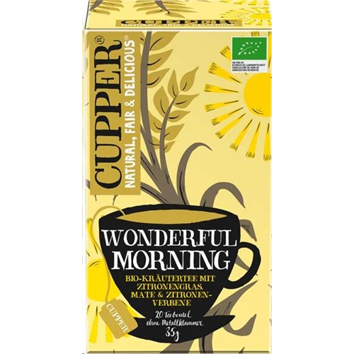 CUPPER Wounderful Morning bio tea - 20 db teafilter. Az álmos reggelekre. Élénkítő, frissítő citromos tea. Koffeint tartalmaz! Összetevők: citromfű* (40%), Yerba mate tea* (23%), citrom verbena* (20%)*, édesgyökér*, citromhéj*( 5%), természetes citrom aroma (4%). Édesgyökeret tartalmaz! Magas vérnyomásban szenvedők kerüljék túlzott mértékű fogyasztását! *Összetevők: Ellenőrzött ökológiai gazdálkodásból. Gyártó: Kallo Foods Ltd., UK. Tárolás: Hűvös száraz helyen. Minőségét megőrzi: lásd a doboz alján. Nettó súly: 35 g. Forg.: Ginger Design Kft. 1087 Budapest, Asztalos Sándor u. 5-7. www.gingerdesign.hu; www.teabox.hu; Forgalmazást ellenőrző szerv: Bio Garancia Kft. (HU-ÖKO-02)