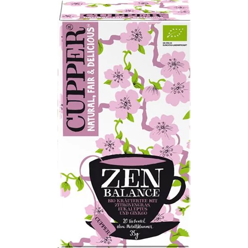 CUPPER Zen Balance bio tea - 20 db teafilter. Koffeinmentes! Citromfű, eukaliptusz és ginkgo harmonikus keveréke, hogy kiegyensúlyozott napja legyen! Összetevők: citromfű* (35%), csalán*, eukaliptusz levél* (20%), csipkebogyó*, ginkgo biloba levelek* (3%). *Összetevők: Ellenőrzött ökológiai gazdálkodásból. Gyártó: Kallo Foods Ltd., UK. Tárolás: Hűvös száraz helyen. Minőségét megőrzi: lásd a doboz alján. Nettó súly: 35 g. Forg.: Ginger Design Kft. 1087 Budapest, Asztalos Sándor u. 5-7. www.gingerdesign.hu; www.teabox.hu; Forgalmazást ellenőrző szerv: Bio Garancia Kft. (HU-ÖKO-02)