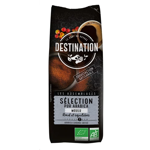 DESTINATION SELECTION Prémium Bio őrőlt kávé. Összetevők: 100% Arabica*. Intenzitás: 7. *Összetevők: Ellenőrzött ökológiai gazdálkodásból. Gyártó: Destination. 5-11 rue Yves Gltoin, 33083 Bordeaux - Franciaország Tárolás: Száraz szobahőmérsékletű helyen. Felbontás után, hűtőszekrény alsó polcán elhelyezve, jól lezárva tárolandó! Minőségét megőrzi: lásd a csomagoláson. Nettó súly: 250 g. Ellenőrizte: FR-BIO-01. Forg: Ginger Design Kft. 1087 Budapest, Asztalos Sándor u. 5-7. www.gingerdesign.hu, www.teabox.hu Forgalmazást ellenőrző szerv: Bio Garancia Kft. (HU-ÖKO-02)