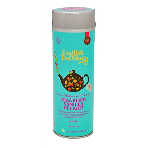 ETS 15 Áfonyás & Vaníliás csoda bio tea - 15 db selyempiramis teafilter, fémdobozban. Koffeinmentes! Összetevők: hibiszkusz*(30%), rooibos*(25%), csipkebogyó*(14%), pörkölt kakaó* (10%), vanília darabok*(10%), természetes ízesítés (5%), áfonya sűrítmény* (3%), málna sűrítmény* (3%). *Összetevők: Ellenőrzött ökológiai gazdálkodásból. Gyártó: The English Tea Shop Ltd. London, Anglia. Csomagolva: Sri Lanka. Tárolás: Hűvös száraz helyen. Minőségét megőrzi: lásd a doboz alján. Control Union/CU LK BIO-149 Nem EU mezőgazdaság. Nettó súly: 30 g. Forg.: Ginger Design Kft. 1087 Budapest, Asztalos Sándor u. 5-7. www.gingerdesign.hu; www.teabox.hu; Forgalmazást ellenőrző szerv: Hungária Öko Garancia Kft. (HU-ÖKO-02)