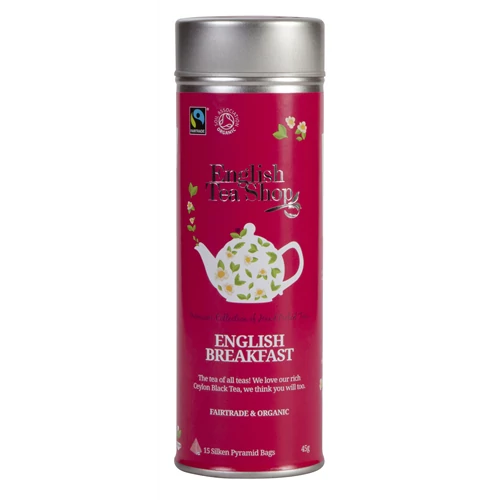 ETS 15 English Breakfast bio & fairtrade tea - 15 db selyempiramis teafilter, fémdobozban. Összetevők: Bio & Fairtrade Ceyloni fekete tea*(100%). *Összetevők: Ellenőrzött ökológiai gazdálkodásból. Gyártó: The English Tea Shop Ltd. London, Anglia. Csomagolva: Sri Lanka. Tárolás: Hűvös száraz helyen. Minőségét megőrzi: lásd a doboz alján. Nettó súly: 45 g. Ellenőrizte: Control Union/CU LK –BIO-149 Nem EU mezőgazdaság. Forg.: Ginger Design Kft. 1087 Budapest, Asztalos Sándor u. 5-7. www.gingerdesign.hu; www.teabox.hu; Forgalmazást ellenőrző szerv: Hungária Öko Garancia Kft. (HU-ÖKO-02)alján. Nettó súly: 45g. Ellenőrizte: Control Union/CU LK –BIO-149 Nem EU mezőgazdaság.