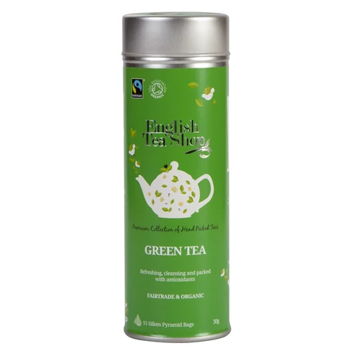 ETS 15 Zöld bio tea - 15 db selyempiramis teafilter, fémdobozban. Összetevők: Bio & Fairtrade Zöld tea*. *Összetevők: Ellenőrzött ökológiai gazdálkodásból. Gyártó: The English Tea Shop Ltd. London, Anglia. Csomagolva: Sri Lanka. Tárolás: Hűvös száraz helyen. Minőségét megőrzi: lásd a doboz alján. Nettó súly: 30 g. Ellenőrizte: Control Union/CU LK –BIO-149 Nem EU mezőgazdaság. Forg.: Ginger Design Kft. 1087 Budapest, Asztalos Sándor u. 5-7. www.gingerdesign.hu; www.teabox.hu; Forgalmazást ellenőrző szerv: Hungária Öko Garancia Kft. (HU-ÖKO-02)