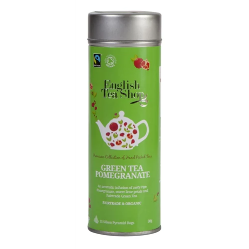 ETS 15 Bio Zöld bio tea gránátalmás - 15 db selyem teafilter, fémdobozban. Összetevők: Bio & Fairtrade Zöld tea*(85%), rózsaszirmok*(5%), gránátalma darabok*(5%), természetes ízesítéssel (5%). *Összetevők: Ellenőrzött ökológiai gazdálkodásból. Gyártó: The English Tea Shop Ltd. London, Anglia. Csomagolva: Sri Lanka. Tárolás: Hűvös száraz helyen. Minőségét megőrzi: lásd a doboz alján. Nettó súly: 30 g. Ellenőrizte: Control Union/CU LK –BIO-149 Nem EU mezőgazdaság. Forg.: Ginger Design Kft. 1087 Budapest, Asztalos Sándor u. 5-7. www.gingerdesign.hu; www.teabox.hu; Forgalmazást ellenőrző szerv: Hungária Öko Garancia Kft. (HU-ÖKO-02)