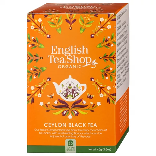 ETS 20 Ceylon, bio fekete tea - 20 db teafilter. Összetevők: bio Ceylon fekete tea (100%) *. *Összetevők: Ellenőrzött ökológiai gazdálkodásból. Gyártó: The English Tea Shop Ltd. London, Anglia. Csomagolva: Sri Lanka. Tárolás: Hűvös száraz helyen. Minőségét megőrzi: lásd a doboz alján. Nettó súly: 45 g. Ellenőrizte: Control Union/CU LK –BIO-149. Nem EU mezőgazdaság. Forg.: Ginger Design Kft. 1087 Budapest, Asztalos Sándor u. 5-7. www.gingerdesign.hu; www.teabox.hu; Forgalmazást ellenőrző szerv: Bio Garancia Kft. (HU-ÖKO-02)