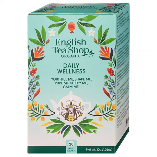 DAILY WELLNESS - 060437 - Net wt. 30g Napi Wellness –válogatás bio teák (5 féle íz) YOUTHFUL ME BIO TEA: Összetevők: hibiszkusz* (40%), csipkebogyó* (40%), homoktövis bogyó* (9%), eper* (4%), vörösáfonya* (4%), kékáfonya* (3%). (Javasolt áztatási idő: 3-5 perc) SHAPE ME BIO TEA: Összetevők: Zöld tea* (54%), fahéj* (23%), gyömbér* (13%), ginseng* (6%), acai bogyó* (4%). (Javasolt áztatási idő: 3-5 perc) PURE ME BIO TEA: Öszetevők: borsmenta* (32%), fodormenta* (16%), görögszéna* (12%), édeskömény magok* (10%), bodza* (8%), kurkuma* (5%), citromhéj* (5%), csalán* (4%), rozmaring* (3%), édesgyökér* (3%), marigold* (2%). "Édesgyökeret tartalmaz - magas vérnyomásban szenvedők, kerüljék túlzott fogyasztását!" (Javasolt áztatási idő: 3-5 perc) SLEEPY ME BIO TEA: Összetevők: kamilla* (62%), levendula rügyek* (12%), komló levelek* (11%), valerian gyökér* (11%), citrom balzsam* (4%). (Javasolt áztatási idő: 3-5 perc) CALM ME BIO TEA: Összetevők: fehéj* (40%), borsmenta* (31%), édesgyökér* (15%), levendula rügyek* (14%) "Édesgyökeret tartalmaz - magas vérnyomásban szenvedők, kerüljék túlzott fogyasztását!" (Javasolt áztatási idő: 3-5 perc) *Összetevők: Ellenőrzött ökológiai gazdálkodásból. Natúr Ceylon Tea és és más teakeverékek, különböző eredetű összetevőkkel ízesítve. Csomagolva: Sri Lanka. Tárolás: Hűvös száraz helyen. Minőségét megőrzi: lásd a doboz hátoldalán. Netto súly: 30g. Gyártó: The English Tea Shop Ltd. London, Nagy-Britannia. Ellenőrizte: Control Union/CU LK –BIO-149. Forg.: GingerDesign Kft. 1087 Budapest, Asztalos Sándor u. 5-7. www.gingerdesign.hu, wwww.teabox.hu. Forgalmazást ellenőrző szerv: Bio Garancia Kft. (HU-ÖKO-02).