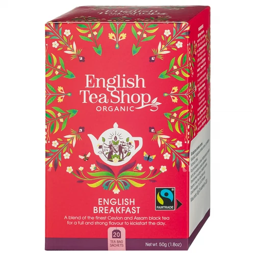 ETS 20 English Breakfast bio fekete tea - 20 db teafilter. Összetevők: ceylon feketet tea (100%)*. *Összetevők: Ellenőrzött ökológiai gazdálkodásból. Gyártó: The English Tea Shop Ltd. London, Anglia. Csomagolva: Sri Lanka. Tárolás: Hűvös száraz helyen. Minőségét megőrzi: lásd a doboz alján. Nettó súly: 50 g. Ellenőrizte: Control Union/CU LK –BIO-149. Nem EU mezőgazdaság. Forg.: Ginger Design Kft. 1087 Budapest, Asztalos Sándor u. 5-7. www.gingerdesign.hu; www.teabox.hu; Forgalmazást ellenőrző szerv: Bio Garancia Kft. (HU-ÖKO-02)