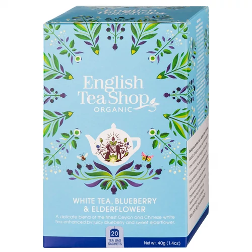 ETS 20 Fehér tea áfonya & bodza bio tea:-20db teafilter. Összetevők: fehér tea (66%)*, citromfű (18%)*, bodzavirág (10%)*, természetes ízesítés (5%), áfonya (1%)*. *Összetevők: Ellenőrzött ökológiai gazdálkodásból. Gyártó: The English Tea Shop Ltd. London, Anglia. Csomagolva: Sri Lanka. Tárolás: Hűvös száraz helyen. Minőségét megőrzi: lásd a doboz alján. Nettó súly:40g. Ellenőrizte: Control Union/CU LK –BIO-149. Nem EU mezőgazdaság. Forg.: Ginger Design Kft. 1087 Budapest, Asztalos Sándor u. 5-7. www.gingerdesign.hu; www.teabox.hu; Forgalmazást ellenőrző szerv: Hungária Öko Garancia Kft. (HU-ÖKO-02)