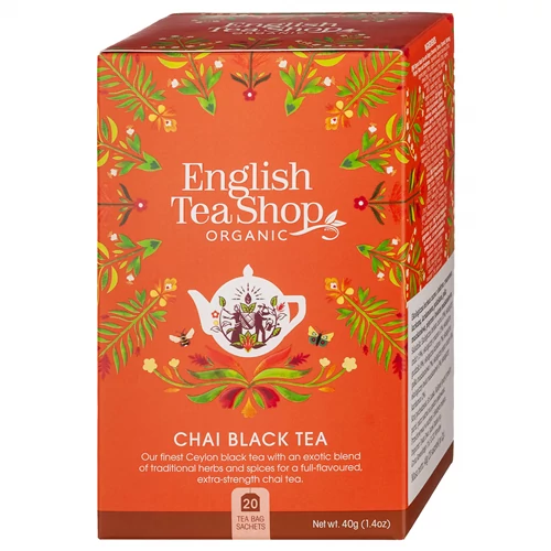 ETS 20 Fekete Chai bio tea. - 20 db teafilter. Összetevők: fekete tea (33%)*, gyömbér (18%)*, fahéj (13%)*, kurkuma: (7%)*, kardamom (7%)*, szegfűszeg*(7%), szerecsendió (6%)*, fekete bors (5%)*, szerecsen dió maghéj (4%)*. *Összetevők: Ellenőrzött ökológiai gazdálkodásból. Gyártó: The English Tea Shop Ltd. London, Anglia. Csomagolva: Sri Lanka. Tárolás: Hűvös száraz helyen. Minőségét megőrzi: lásd a doboz alján. Nettó súly: 40 g. Ellenőrizte: Control Union/CU LK –BIO-149. Nem EU mezőgazdaság. Forg.: Ginger Design Kft. 1087 Budapest, Asztalos Sándor u. 5-7. www.gingerdesign.hu; www.teabox.hu; Forgalmazást ellenőrző szerv: Bio Garancia Kft. (HU-ÖKO-02)