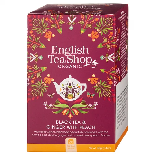ETS 20 Gyömbér & Barack fekete bio tea. - 20db teafilter. Összetevők: fekete tea (78%)*, gyömbér (12%)*, barack (5%)* természetes ízesítés (5%). *Összetevők: Ellenőrzött ökológiai gazdálkodásból. Gyártó: The English Tea Shop Ltd. London, Anglia. Csomagolva: Sri Lanka. Tárolás: Hűvös száraz helyen. Minőségét megőrzi: lásd a doboz alján. Nettó súly: 40 g. Ellenőrizte: Control Union/CU LK –BIO-149. Nem EU mezőgazdaság. Forg.: Ginger Design Kft. 1087 Budapest, Asztalos Sándor u. 5-7. www.gingerdesign.hu; www.teabox.hu; Forgalmazást ellenőrző szerv: Bio Garancia Kft. (HU-ÖKO-02)