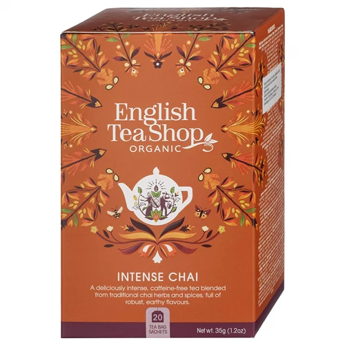 Ets 20 Intenzív Chai bio tea. - 20db teafilter. Összetevők: fahéj (44%)*, gyömbér (19%)*, kurkuma (7%)*, kardamom ( 6%)*, édeskömény( 6%)*, fekete bors (6%)*, szegfűszeg (5%)*, édesgyökér (5%)*, természetes fahéj ízesítés (2%). Édesgyökeret tartalmaz! Magasvérnyomásban szenvedőknek kerülniük kell a túlzott fogyasztását. *Összetevők: Ellenőrzött ökológiai gazdálkodásból. Gyártó: The English Tea Shop Ltd. London, Anglia. Csomagolva: Sri Lanka. Tárolás: Hűvös száraz helyen. Minőségét megőrzi: lásd a doboz alján. Nettó súly: 35 g. Ellenőrizte: Control Union/CU LK –BIO-149. Nem EU mezőgazdaság. Forg.: Ginger Design Kft. 1087 Budapest, Asztalos Sándor u. 5-7. www.gingerdesign.hu; www.teabox.hu; Forgalmazást ellenőrző szerv: Hungária Öko Garancia Kft. (HU-ÖKO-02)