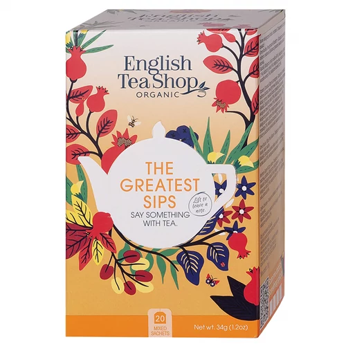 THE GREATEST SIPS - 060154 - Net wt. 34g Legnemesebb kortyok –válogatás bio teák. (5 féle íz) Gránátalmás áfonyás zöld rooibos bio tea Összetevők: zöld rooibos* (64%), hibiszkusz* (19%), gránátalma* (6%), maracuja gyümölcs virág* (5.5%), természetes ízesítés (5%), áfonya* (0.5%) (Javasolt áztatási idő: 4-5 perc) Kurkumás Gyömbér Citromfű bio tea Összetevők: gyömbér* (30%), kurkuma* (30%), citromfű* (14%), édesgyökér* (7%), szegfűszeg* (6%), citromhéj* (4%), kardamom* (4%), fekete bors* (3%), köménymag* (2%). "Édesgyökeret tartalmaz - magas vérnyomásban szenvedők, kerülje a túlzott fogyasztását!" (Javasolt áztatási idő: 3-4 perc) Fehér teás zöld bio sencha tea & matchával. Összetevők: Sencha tea* (61%), fehér tea* (30%), matcha por* (9%) (Javasolt áztatási idő: 2-3 perc) Céklás Gyömbéres & Curry leveles bio tea Összetevők: cékla* (41%), répa* (23%), gyömbér* (15%), curry levelek* (15%), petrezselyem* (6%). (Javasolt áztatási idő: 4-5 perc) Ceyloni Fahéjjas Gyömbéres bio tea Összetevők: fahéj* (90%), gyömbér* (6%), kardamom* (4%) (Javasolt áztatási idő: 3-5 perc) *Összetevők: Ellenőrzött ökológiai gazdálkodásból. Natúr Ceylon Tea és és más teakeverékek, különböző eredetű összetevőkkel ízesítve. Csomagolva: Sri Lanka. Tárolás: Hűvös száraz helyen. Minőségét megőrzi: lásd a doboz hátoldalán. Netto súly: 34g. Gyártó: The English Tea Shop Ltd. London, Nagy-Britannia. Ellenőrizte: Control Union/CU LK –BIO-149. Forg.: GingerDesign Kft. 1087 Budapest, Asztalos Sándor u. 5-7. www.gingerdesign.hu, wwww.teabox.hu. Forgalmazást ellenőrző szerv: Hungária Öko Garancia Kft. (HU-ÖKO-02).
