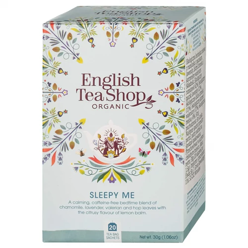 ETS 20 Wellness Sleepy me bio tea-Álomba ringató bio tea.- 20 db teafilter. Koffeinmentes! Összetevők: kamilla (62%)*, levendula rügyek (12%)*, komló levelek (11%)*, valeriána gyökér (11%)*, citrombalzsam (4%)*. *Összetevők: Ellenőrzött ökológiai gazdálkodásból. Gyártó: The English Tea Shop Ltd. London, Anglia. Csomagolva: Sri Lanka. Tárolás: Hűvös száraz helyen. Minőségét megőrzi: lásd a doboz alján. Nettó súly: 30 g. Ellenőrizte: Control Union/CU LK –BIO-149. Nem EU mezőgazdaság. Forg.: Ginger Design Kft. 1087 Budapest, Asztalos Sándor u. 5-7. www.gingerdesign.hu; www.teabox.hu; Forgalmazást ellenőrző szerv: Bio Garancia Kft. (HU-ÖKO-02)