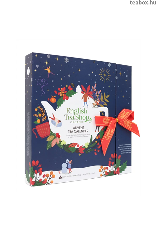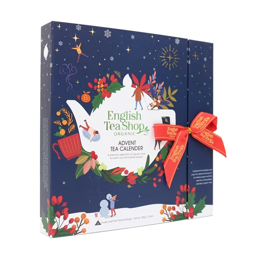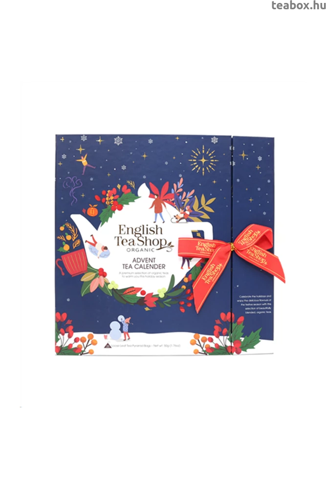 ETS 25 Adventi kalendárium bio teaválogatás –ünnepi kék masnis (13 íz) Gingerbread Treat – bio fekete tea fahéj, gyömbér, alma és kardamom. Összetevők: fekete tea* (53%), fahéj* (21%), gyömbér* (15%), alma (6%), kardamom* (1%), természetes gyömbér ízesítés (1,5%), természetes vanília ízesítés (0,5%), citrom olaj* (0,5%) Ghostly Green - bio zöld tea fahéjjal, gyömbér, borsmenta és rózsaszirom. Összetevők: zöld tea* (73,5%), fahéj* (14%), gyömbér* (5%), borsmenta levelek* (4%), borsmenta olaj*(3%), rózsaszirom*(0,5%). White Wonderland - bio fehér tea fahéjjal, kakaó, borsmenta, édesgyökér és kamilla. Összetevők: fehér tea* (75%), fahéj* (8%), kakaó* (4,75%), borsmenta levelek* (4%), édesgyökér* (4%), természetes kókusz ízesítés (2,5%), természetes kakaó ízesítés (1,75%). Édesgyökeret tartalmaz - magas vérnyomásban szenvedők kerüljék a túlzott mértékű fogyasztását!” Festive Spice - bio fekete tea fahéj, narancs, gyömbér, kardamom, szegfűszeg, szerecsendió és bors. Összetevők: fekete tea* (74%), fahéj* (7%), narancshéj* (4%), gyömbér* (3%), bors* (2%), természetes vanília ízesítés (2,5%), szegfűszeg* (2%), szerecsendió* (2%), természetes alma ízesítés (2%), kardamom* (1%). Winter Warmer - bio rooibos tea gyömbérrel, kakaó, csillagánizs és szerecsendióvirág. Összetevők: rooibos* (62%), gyömbér* (15%), kakaó* (15%), természetes vanília ízesítés (4%), csillagánizs* (2%), szerecsendióvirág* (2%). Super Star Anise - bio fekete tea gyömbér, szegfűszeg és csillagánizs. Összetevők: fekete tea* (84,5%), gyömbér* (6%), szegfűszeg* (5%), természetes borsmenta ízesítés (2%), természetes csillagánizs ízesítés* (1,5%), csillagánizs* (1%). Tropical Lemongrass - bio citromfűtea borsmenta, hibiszkusz, csipkebogyó, kamilla és alma. Összetevők: citromfű* (34%), borsmenta levelek* (20%), hibiszkusz* (20%), csipkebogyó* (11%), alma* (10%), természetes mangó ízesítés (2,5%), természetes barack ízesítés (1,5%), természetes ananász ízesítés (1%). Happy Holiday - bio zöld tea fahéjjal, gránátalma, gyömbér, kardamom, szegfűszeg, szerecsendió és bors. Összetevők: zöld tea* (83%), fahéj* (5%), bors* (2%), természetes citrom ízesítés (2%), természetes gránátalma ízesítés (2%), gránátalma* (2%), gyömbér* (1,5%), szegfűszeg* (1%), szerecsendió* (1%), kardamom* (0,5%). Post-party Refresh - bio zöld tea fahéjjal, garciniával és acai bogyóval. Összetevők: zöld tea (64,5%), garcinia* (17%), fehéj* (14%), természetes gránátalma ízesítés (2%), természetes ananász ízesítés (2%), acai bogyók* (0,5%). Chai Charge - bio rooibosz tea fahéjjal, szegfűszeg, kurkuma, kardamom, fokhagyma és kék kukorica virága. Összetevők: rooibos* (66%), fahéj* (16%), szegfűszeg* (7%), kurkuma* (3%), természetes eper ízesítés (3%), természetes fahéj ízesítés (2%), kardamom* (1%), fokhagyma* (1%), kék kukoricavirág* (1%). Punchy Peppermint - bio zöld tea fahéjjal, borsmenta és édesgyökér. Összetevők: zöld tea* (73.5%), fahéj* (10%), borsmenta levelek* (8,5%), édesgyökér* (4%), természetes ananász ízesítés (3%), természetes borsmenta ízesítés (1%). Édesgyökeret tartalmaz! Mmagas vérnyomásban szenvedők kerüljék a túlzott mértékű fogyasztását! Spooky Spice - bio zöld tea fahéjjal, gyömbér, kardamom, szegfűszeg, szerecsendió és bors. Összetevők: zöld tea* (78%), fahéj* (7%) gyömbér* (2,5%), szegfűszeg* (2.5%), szerecsendió* (2.5%), bors* (2.5%), természetes ananász ízesítés (2,5%9, természetes narancs ízesítés (1,5%), kardampm* (1%). Peppermint Candy - bio borsmenta gyógynövény tea és zöld tea naranccsal, fahéj, pörkölt árpa és vanília. Összetevők: zöld tea* (32.5%), borsmenta levelek* (32%), fahéj* (14%), narancshéj* (11%), pörkölt árpa* (5%), természetes vanília ízesítés (2%), természetes borsmenta ízesítés (1,5%), természetes kakaó ízesítés (1,5%) vanília rúd* (0.5%). *Összetevők: Ellenőrzött ökológiai gazdálkodásból. Gyártó: The English Tea Shop Ltd. London, Anglia. Csomagolva: Sri Lanka. Tárolás: Hűvös száraz helyen. Minőségét megőrzi: lásd a doboz alján. Control Union/CU LK BIO-149 Nem EU mezőgazdaság. Nettó súly: 50 g. Forg.: Ginger Design Kft. 1087 Budapest, Asztalos Sándor u. 5-7. www.gingerdesign.hu; www.teabox.hu; Forgalmazást ellenőrző szerv: Bio Garancia Kft. (HU-ÖKO-02) VEGAN