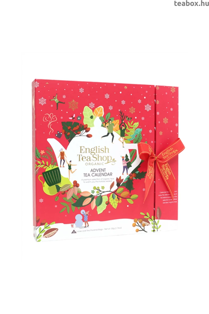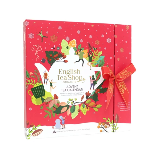 ETS 25 Adventi kalendárium bio teaválogatás –ünnepi piros masnis (13 íz) Gingerbread Treat – bio fekete tea fahéj, gyömbér, alma és kardamom. Összetevők: fekete tea* (53%), fahéj* (21%), gyömbér* (15%), alma (6%), kardamom* (1%), természetes gyömbér ízesítés (1,5%), természetes vanília ízesítés (0,5%), citrom olaj* (0,5%) Ghostly Green - Összetevők: zöld tea* (73,5%), fahéj* (14%), gyömbér* (5%), borsmenta levelek* (4%), borsmenta olaj*(3%), rózsaszirom*(0,5%). Irish Holiday – bio fekete tea, gyömbér, rooibos, fahéj. Összetevők: fekete tea* (82%), rooibos* (5%), fehéj* (4.5%), gyömbér* (4%), természetes kókusz ízesítés (2.5%), természetes vanília ízesítés (2%). Festive Spice - bio fekete tea fahéj, narancs, gyömbér, kardamom, szegfűszeg, szerecsendió és bors. Összetevők: fekete tea* (74%), fahéj* (7%), narancshéj* (4%), gyömbér* (3%), bors* (2%), természetes vanília ízesítés (2,5%), szegfűszeg* (2%), szerecsendió* (2%), természetes alma ízesítés (2%), kardamom* (1%). Winter Warmer - bio rooibos tea gyömbérrel, kakaó, csillagánizs és szerecsendióvirág. Összetevők: rooibos* (62%), gyömbér* (15%), kakaó* (15%), természetes vanília ízesítés (4%), csillagánizs* (2%), szerecsendióvirág* (2%). Super Star Anise - bio fekete tea gyömbér, szegfűszeg és csillagánizs. Összetevők: fekete tea* (84,5%), gyömbér* (6%), szegfűszeg* (5%), természetes borsmenta ízesítés (2%), természetes csillagánizs ízesítés* (1,5%), csillagánizs* (1%). Tropical Lemongrass - bio citromfűtea borsmenta, hibiszkusz, csipkebogyó, kamilla és alma. Összetevők: citromfű* (34%), borsmenta levelek* (20%), hibiszkusz* (20%), csipkebogyó* (11%), alma* (10%), természetes mangó ízesítés (2,5%), természetes barack ízesítés (1,5%), természetes ananász ízesítés (1%). Happy Holiday - bio zöld tea fahéjjal, gránátalma, gyömbér, kardamom, szegfűszeg, szerecsendió és bors. Összetevők: zöld tea* (83%), fahéj* (5%), bors* (2%), természetes citrom ízesítés (2%), természetes gránátalma ízesítés (2%), gránátalma* (2%), gyömbér* (1,5%), szegfűszeg* (1%), szerecsendió* (1%), kardamom* (0,5%). Post-party Refresh - bio zöld tea fahéjjal, garciniával és acai bogyóval. Összetevők: zöld tea (64,5%), garcinia* (17%), fehéj* (14%), természetes gránátalma ízesítés (2%), természetes ananász ízesítés (2%), acai bogyók* (0,5%). Chai Charge - bio rooibosz tea fahéjjal, szegfűszeg, kurkuma, kardamom, fokhagyma és kék kukorica virága. Összetevők: rooibos* (66%), fahéj* (16%), szegfűszeg* (7%), kurkuma* (3%), természetes eper ízesítés (3%), természetes fahéj ízesítés (2%), kardamom* (1%), fokhagyma* (1%), kék kukoricavirág* (1%). Peachy Keen – bio hibiszkusz tea csipkebogyóval, citromfűvel, fahéjjal almával. Összetevők: hibiszkusz*(55%), csipkebogyó* (20%), citromhéj* (5%), citromfű* (5%), fahéj* (5%), alma* ( 5.5%), természetes barack ízesítés (3,5%), természetes ananász ízesítés (1%). Spooky Spice - bio zöld tea fahéjjal, gyömbér, kardamom, szegfűszeg, szerecsendió és bors. Összetevők: zöld tea* (78%), fahéj* (7%) gyömbér* (2,5%), szegfűszeg* (2.5%), szerecsendió* (2.5%), bors* (2.5%), természetes ananász ízesítés (2,5%9, természetes narancs ízesítés (1,5%), kardamom* (1%). Peppermint Candy - bio borsmenta gyógynövény tea és zöld tea naranccsal, fahéj, pörkölt árpa és vanília. Összetevők: zöld tea* (32.5%), borsmenta levelek* (32%), fahéj* (14%), narancshéj* (11%), pörkölt árpa* (5%), természetes vanília ízesítés (2%), természetes borsmenta ízesítés (1,5%), természetes kakaó ízesítés (1,5%) vanília rúd* (0.5%). *Összetevők: Ellenőrzött ökológiai gazdálkodásból. Gyártó: The English Tea Shop Ltd. London, Anglia. Csomagolva: Sri Lanka. Tárolás: Hűvös száraz helyen. Minőségét megőrzi: lásd a doboz alján. Control Union/CU LK BIO-149 Nem EU mezőgazdaság. Nettó súly: 50 g. Forg.: Ginger Design Kft. 1087 Budapest, Asztalos Sándor u. 5-7. www.gingerdesign.hu; www.teabox.hu; Forgalmazást ellenőrző szerv: Bio Garancia Kft. (HU-ÖKO-02) VEGAN