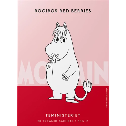 MOOMIN Rooibos Pirosbogyós tea - 20db selyempiramis teafilter. Összetevők: rooibos, ribizli, ízesítés, ananász, papaya, rózsaszirom, eper, málna. Koffeinmentes! Javasolt áztatási idő: 100°C vízben 5-8 percig áztatva. Gyártó: TEMINISTERIET, Svédország. Tárolás: száraz, hűvös helyen. Minőségét megőrzi: lásd a doboz alján. Nettó súly: 30g. Forg.: Ginger Design Kft. 1087 Budapest, Asztalos Sándor u. 5-7. www.gingerdesign.hu; www.teabox.hu; Ingredients:rooibos, currants, flavouring, pineapple, papaya,rose petals, strawberry, raspberries. This natural herbal tea blend combines rooibos tea with sweet and tart flavors of red berries and currants to provide a caffeine-free tea that packs a flavorful punch. Rich in antioxidants, rooibos is a superfood powerhouse. Enjoy this delicious tea blend any time of day.